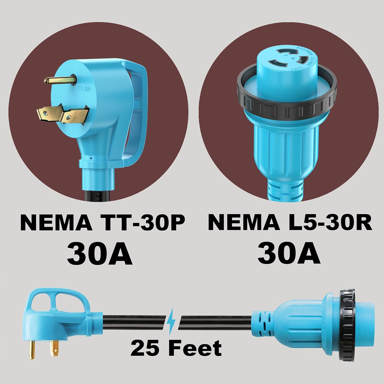 - Electrical Rating: RV 30 amp power cord, 30 Amp, 125 Volt, max rate 3750 Watts, STW pure copper power cord with TT-30P male plug and L5-30R twist lock female receptacle for RV trailer campers