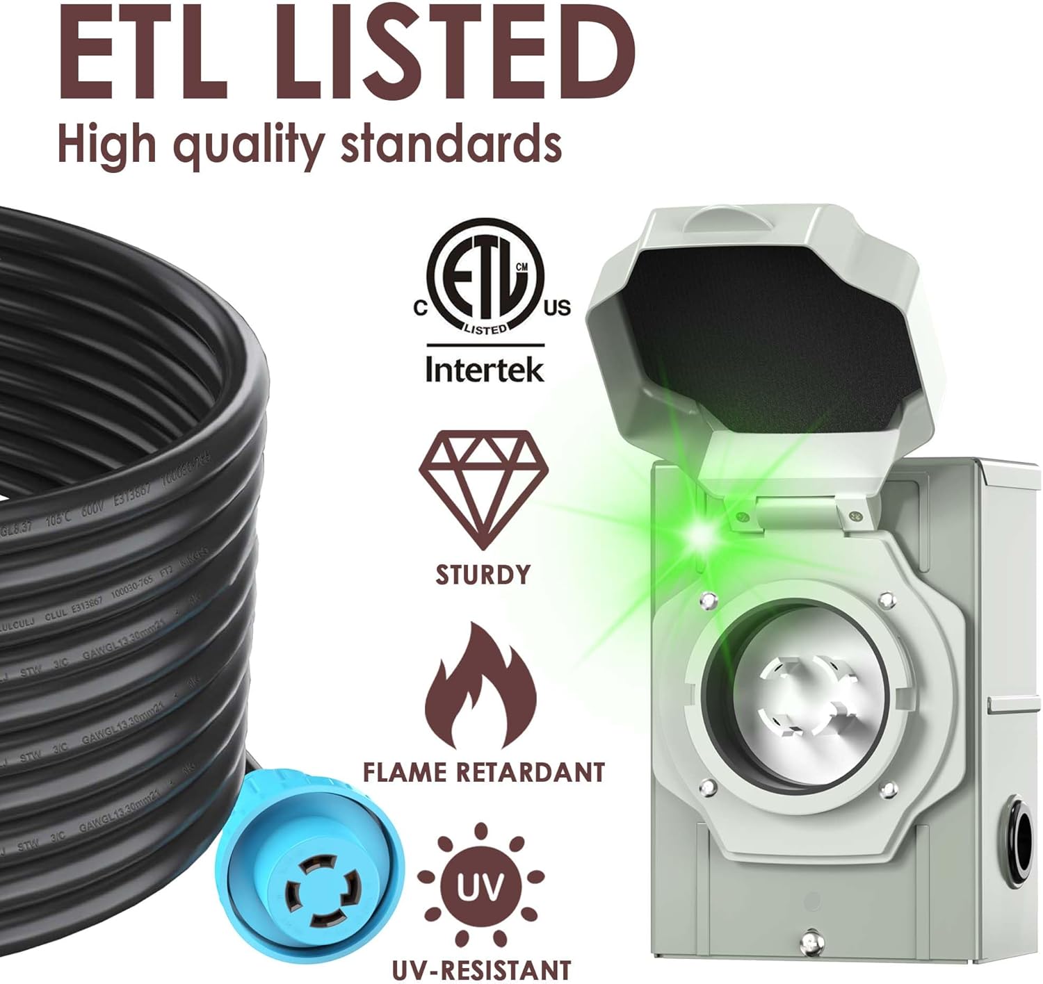 - ETL Listed: High quality standards. 10 gauge 4 prong SJTW 125/250V up to 7500W, NEMA L14-30P male to L14-30R female twist lock, ETL Listed