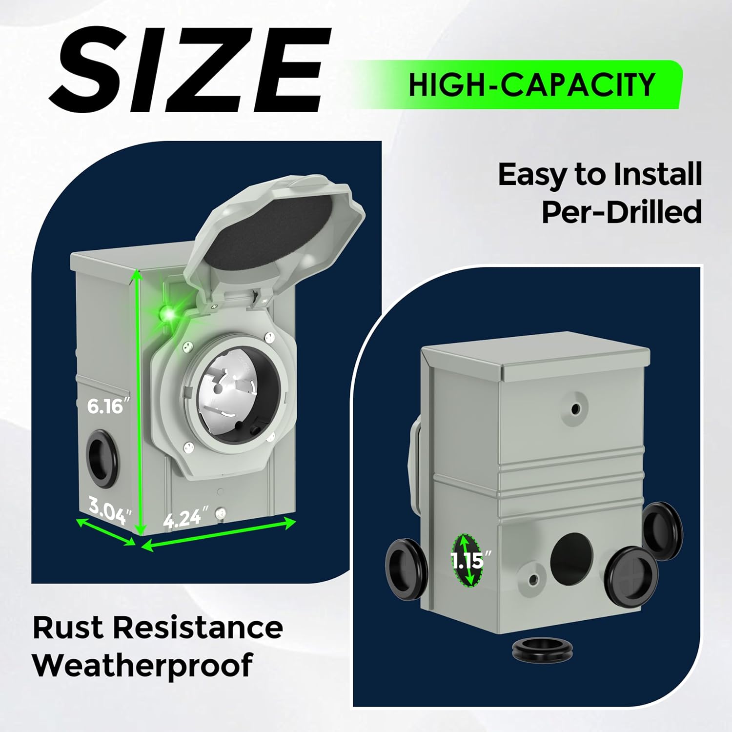 - Power Inlet Box: Designed with 4 pre-drilled holes, it makes installation more convenient. The surface of the metal body is covered by an anti-rust powder coating that can resist weather damage like rain, snow, and UV